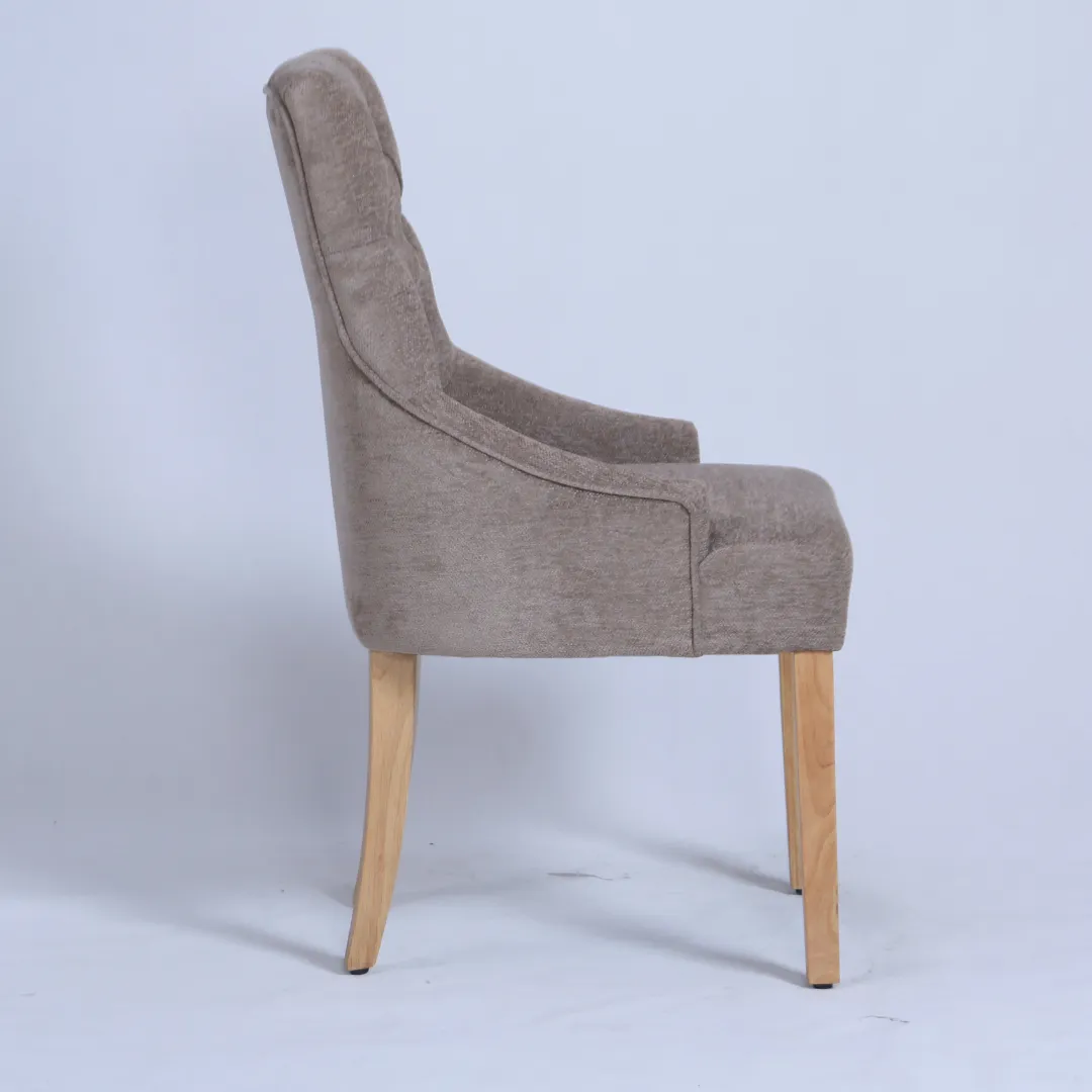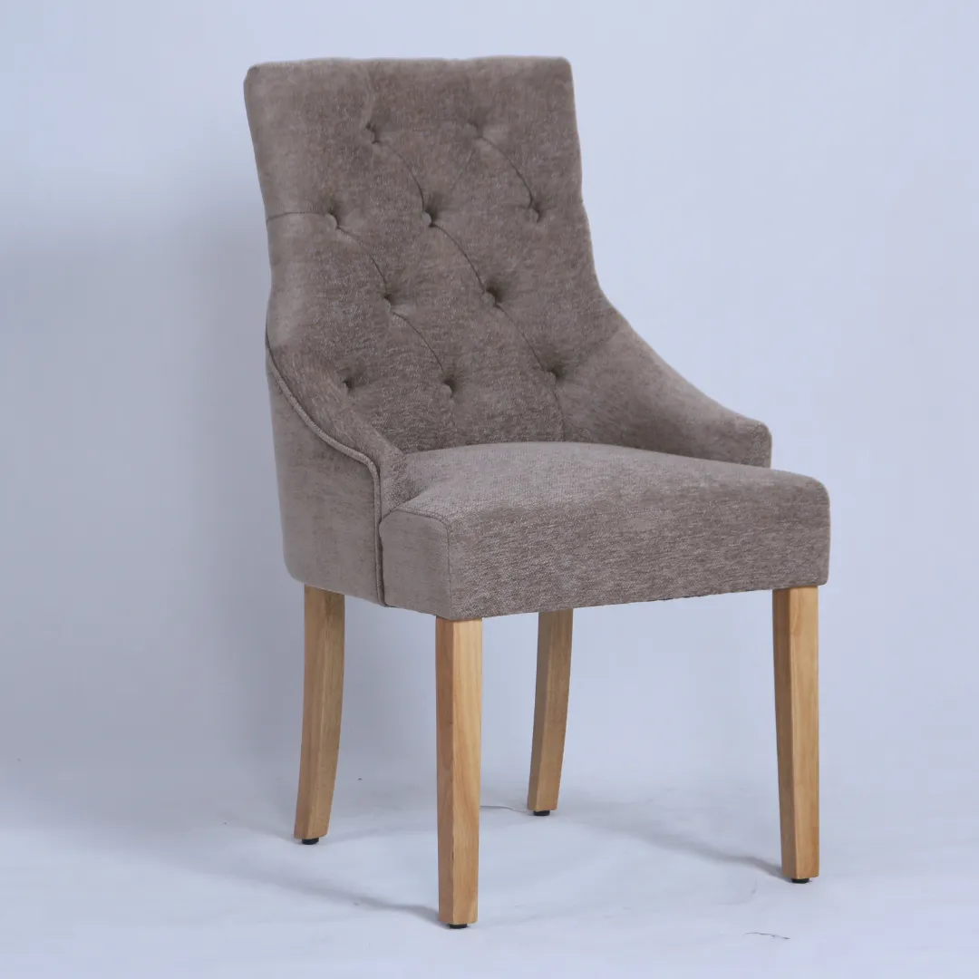 The Bentley Dining Chair features a gently curved backrest with deep button-tufted detailing for a refined, tailored look. Upholstered in soft chenille fabric, it provides a plush seating experience while adding texture and elegance to your dining area. The sturdy wooden legs in a natural finish ensure durability and stability, making Bentley as practical as it is beautiful.