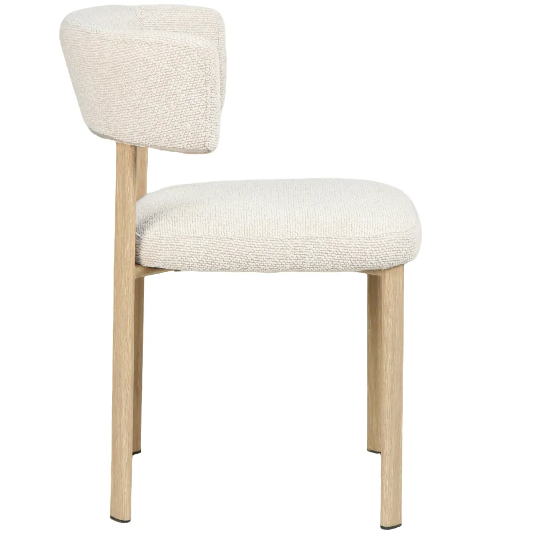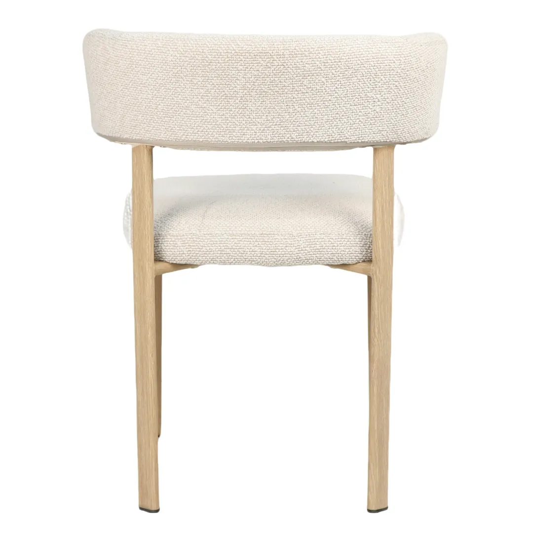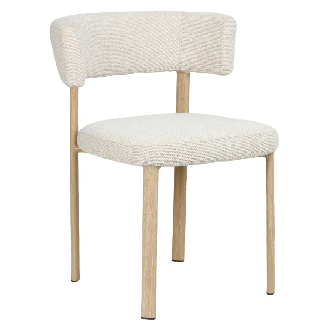 Upholstered in a textured boucle‑style fabric, Melissa offers a soft, inviting feel, while the supportive rounded back provides excellent comfort for long, relaxed meals. The slim linear legs add a refined touch, giving the chair a light, elegant silhouette without compromising stability.