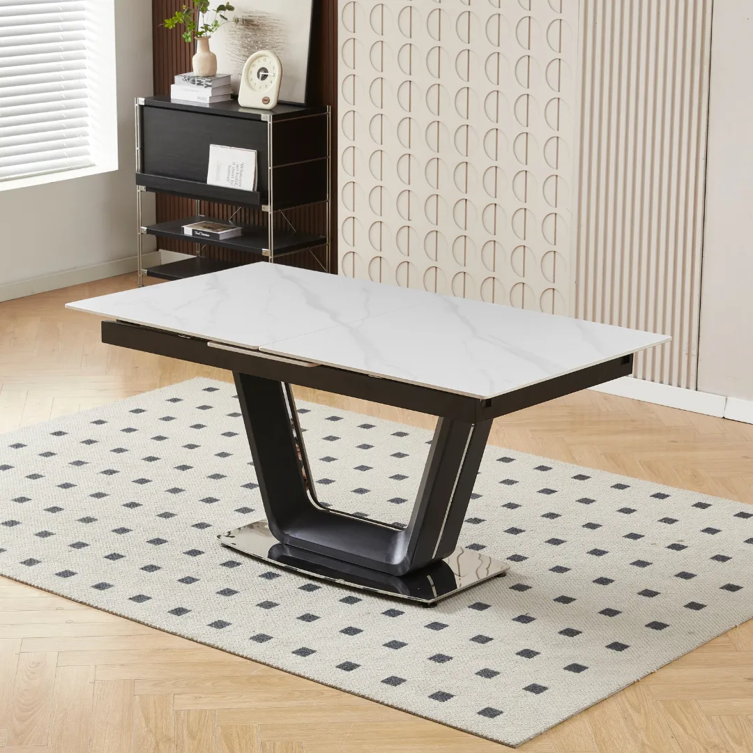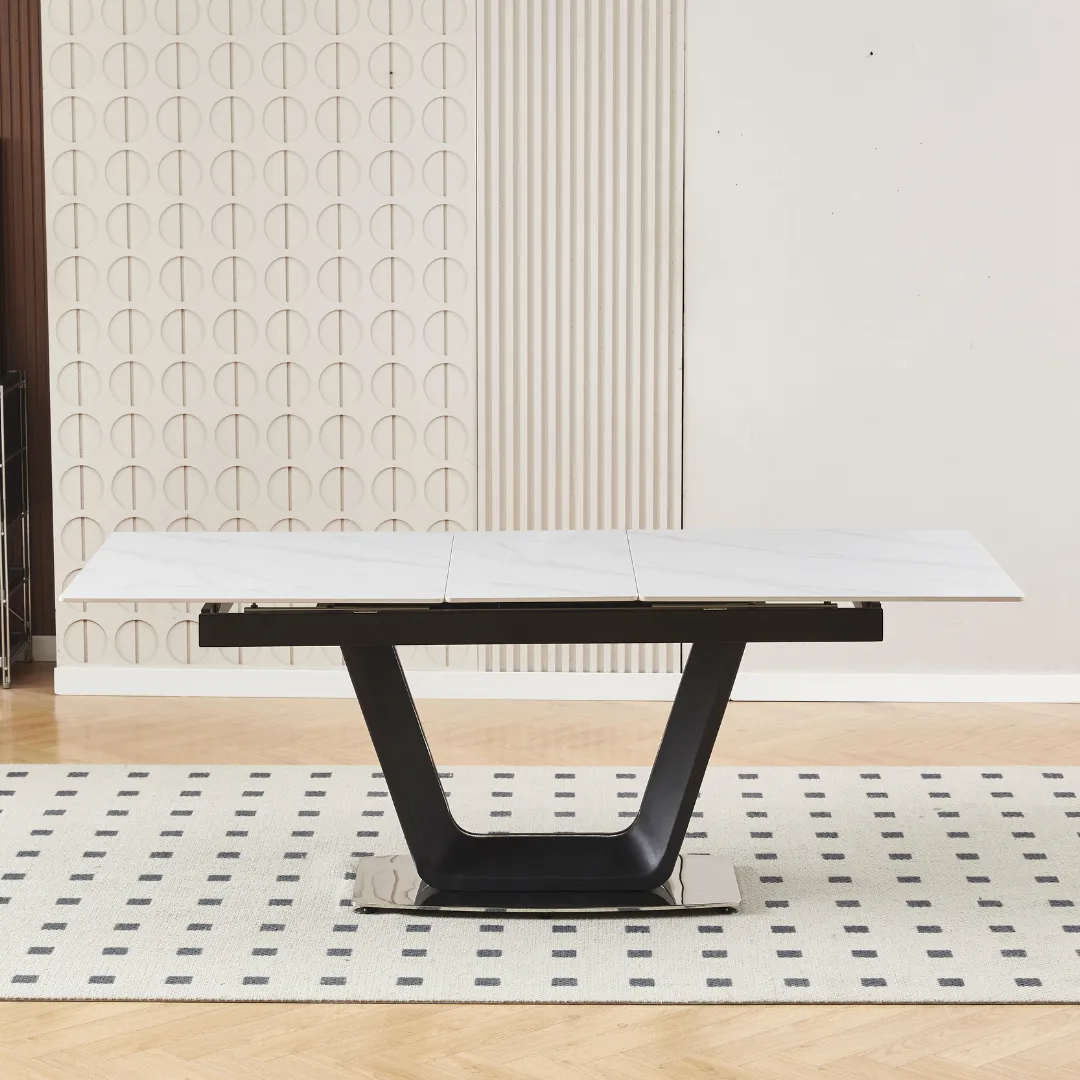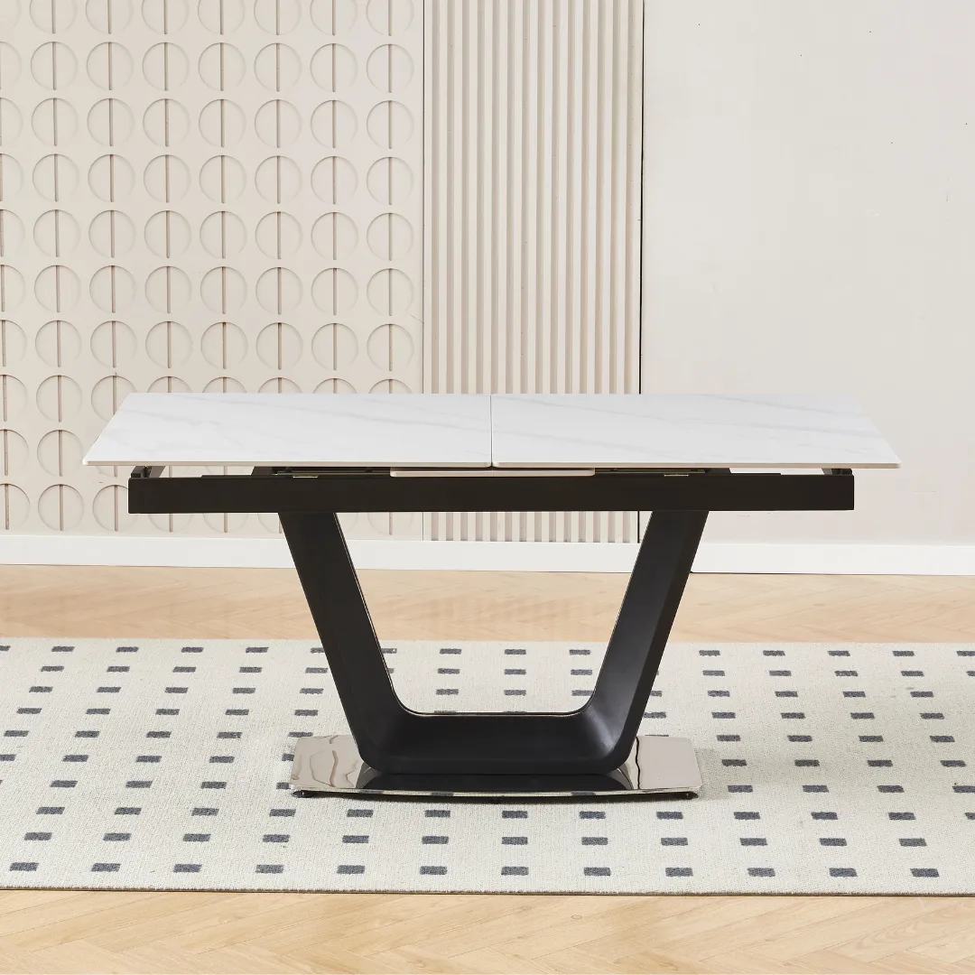 The table extends effortlessly from 160cm to 200cm, making it perfect for both intimate meals and larger gatherings. Its V-shaped base, finished in matte black with chrome accents, offers architectural flair and robust stability, ensuring the table remains a striking centerpiece in any setting.