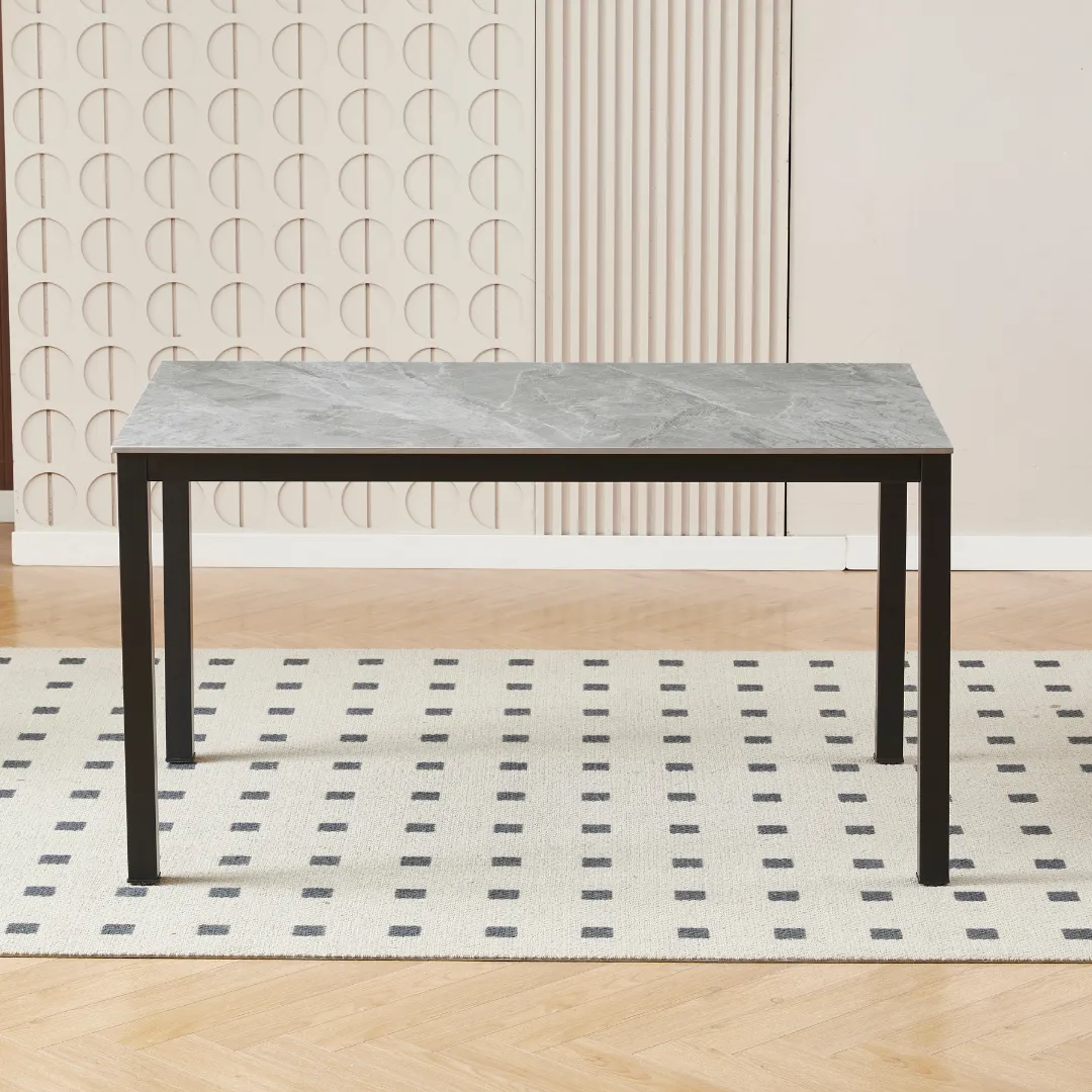 Measuring 140 x 80 x 76 cm, it comfortably seats four to six people, making it ideal for both everyday meals and formal gatherings. The tabletop features a smooth, marble-inspired surface that’s easy to clean and maintain, while the black metal legs provide sturdy support and a bold contrast that enhances its architectural appeal.
