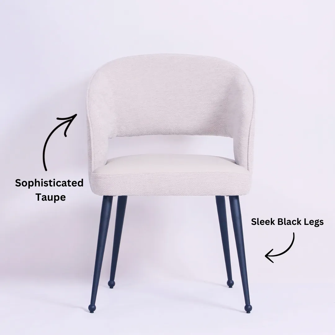Delivery & ReturnsElevate your dining experience with the Ria Dining Chair, a perfect blend of elegance and comfort. The sophisticated taupe color adds a touch of understated luxury to any dining space, while the sleek black legs provide a striking contrast that enhances its modern appeal. Designed with both style and comfort in mind, the Ria Dining Chair offers an inviting seating experience, making it ideal for long, leisurely dinners. Its elegant design ensures it stands out as a statement piece in your home.