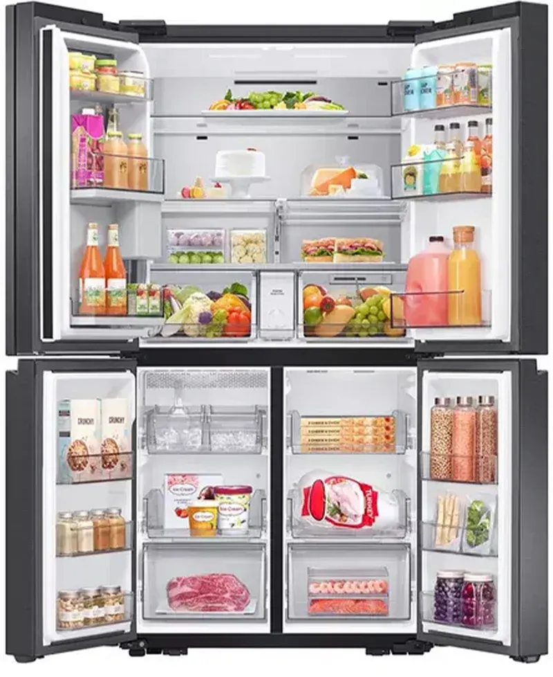 The Samsung Smart Fridge Freezer features a sleek black finish with a fingerprint-resistant coating, ensuring it stays looking pristine. Its multi-door design offers easy access to all compartments, while the spacious interior provides ample storage for all your groceries.
