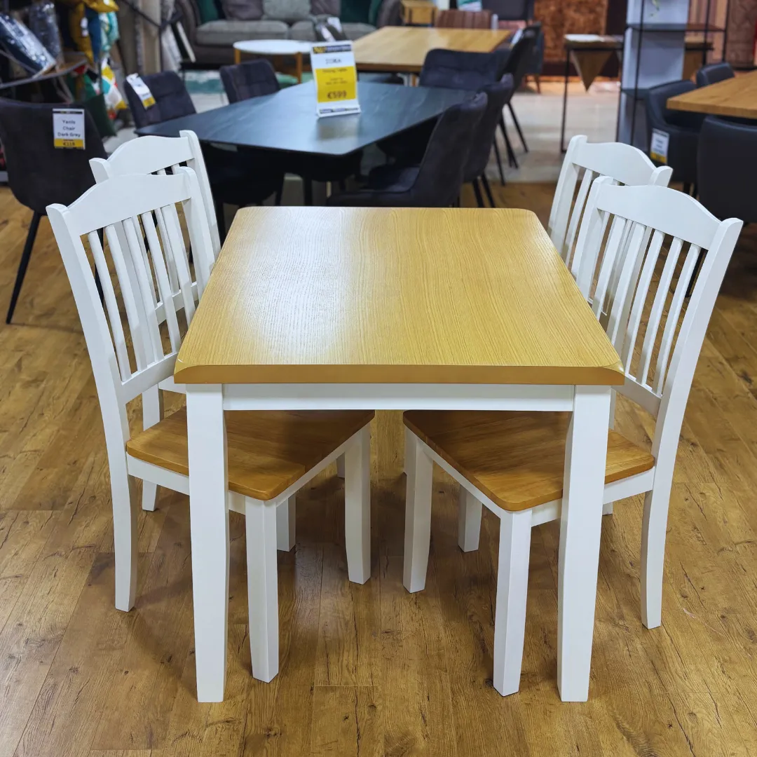 Delivery & ReturnsElevate your dining experience with the Achill Dining Table set. This elegant ensemble features a beautifully crafted 1.2m dining table paired with four matching chairs, perfect for family meals or entertaining guests.