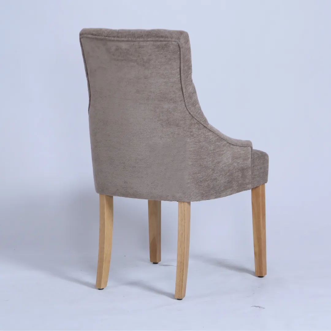 The Bentley Dining Chair features a gently curved backrest with deep button-tufted detailing for a refined, tailored look. Upholstered in soft chenille fabric, it provides a plush seating experience while adding texture and elegance to your dining area. The sturdy wooden legs in a natural finish ensure durability and stability, making Bentley as practical as it is beautiful.
