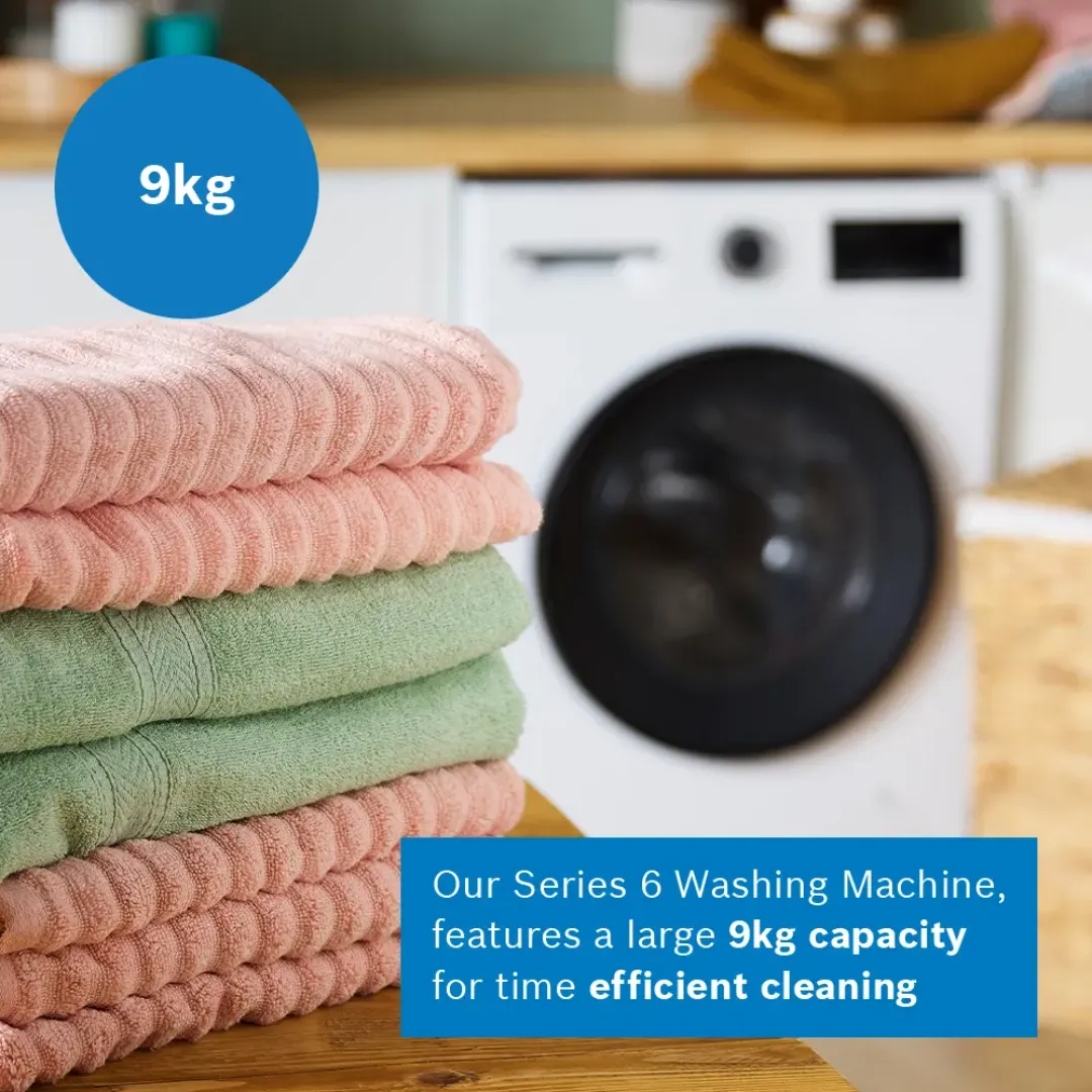 The sleek white finish gives the machine a clean, modern look that fits seamlessly into any utility room or kitchen. Built with Bosch’s renowned engineering, the Series 6 range is known for reliability, durability, and quiet operation, making it ideal for busy households.