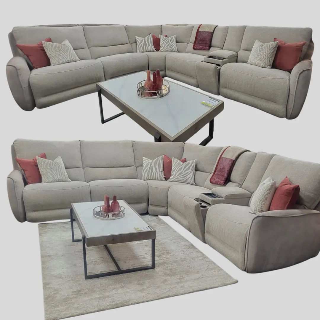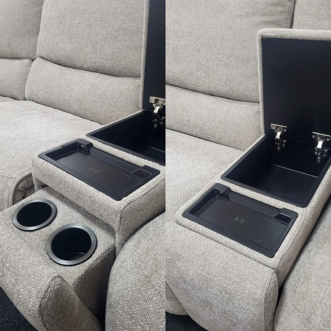 Whether you're relaxing solo or entertaining guests, the Hampton offers tailored comfort with dual-motion electric reclining and adjustable headrests and leg supports. The integrated console unit adds functionality with USB charging, wireless charging, cup holders, and hidden storage, all seamlessly built into the design.
