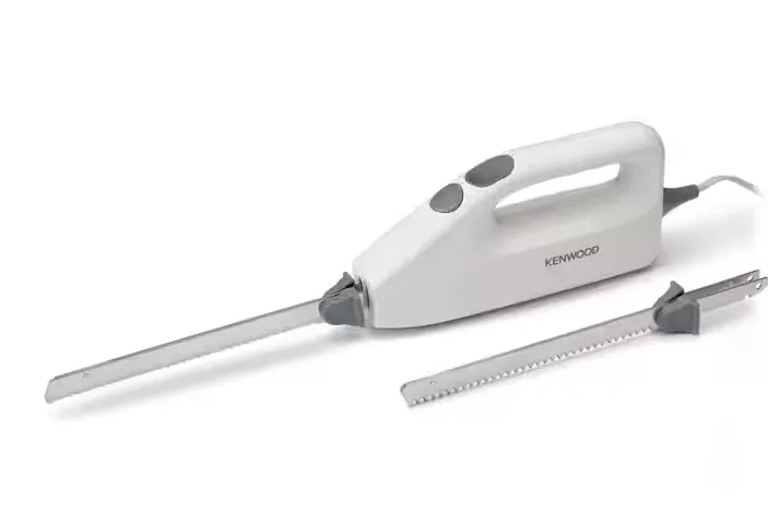 This modern, white electric knife is not only functional but also a sleek addition to any kitchen, making meal preparation quicker and more efficient.