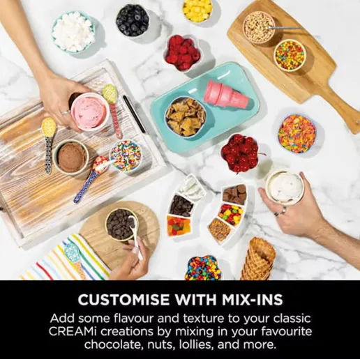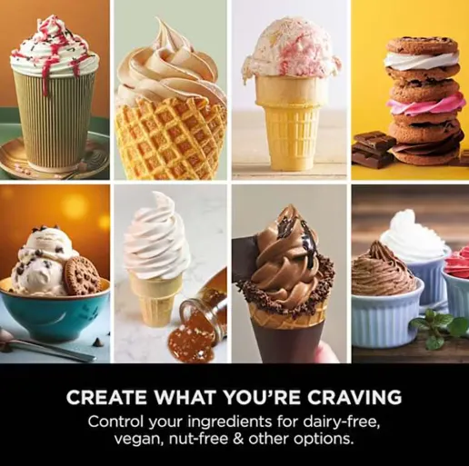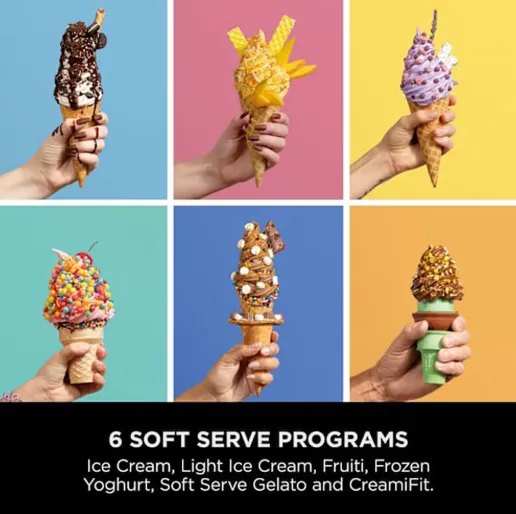 - 13 One-Touch Programs, Includes presets for: Scooped Ice Cream, Lite Ice Cream, Sorbet, Gelato, Mix-ins, Frozen Yogurt, Milkshake, Soft Serve Ice Cream, Soft Serve Lite Ice Cream, Fruit Whip, Frozen Custard, Soft Serve Frozen Yogurt and CREAMiFit (for low-calorie, high-protein treats).