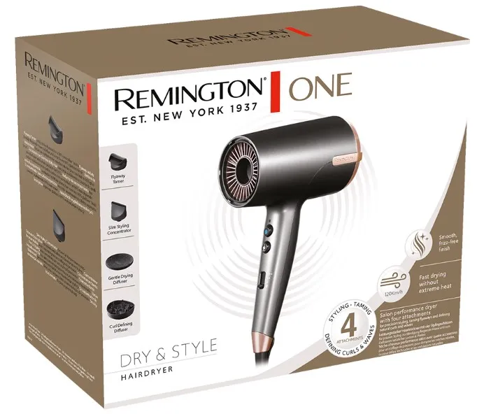 Delivery & ReturnsThe Remington ONE Dry & Style Hair Dryer (D6077) is a high-performance hair styling tool designed to cater to various hair types and styling needs. Equipped with a powerful 2000W motor, it generates air speeds of up to 120 km/h, ensuring 25% faster drying times. The hair dryer features four versatile attachments: a Slim Styling Concentrator for precise airflow, a Flyaway Tamer for sleek finishes, a Gentle Drying Diffuser for natural curls, and a Curl Defining Diffuser for enhanced curl definition.