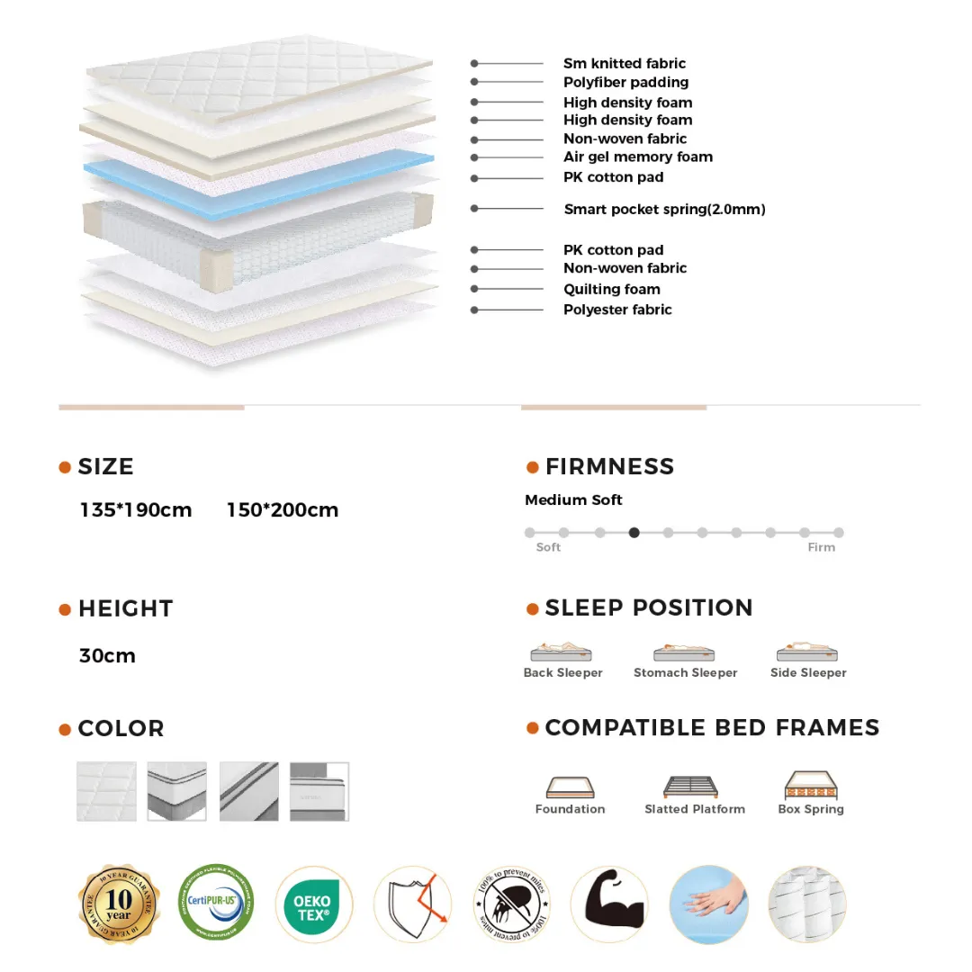 The Kilrush Mattress is produced with quality, certified materials and built to provide long‑lasting comfort. Breathable layers and gel‑infused memory foam help maintain a cooler sleep environment, while the durable pocket spring core ensures consistent support year after year.