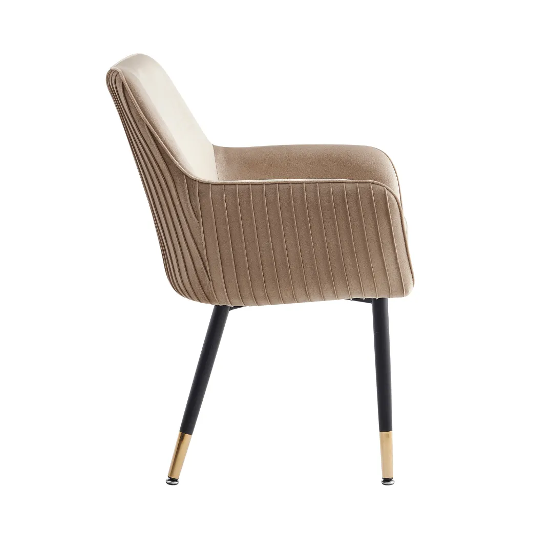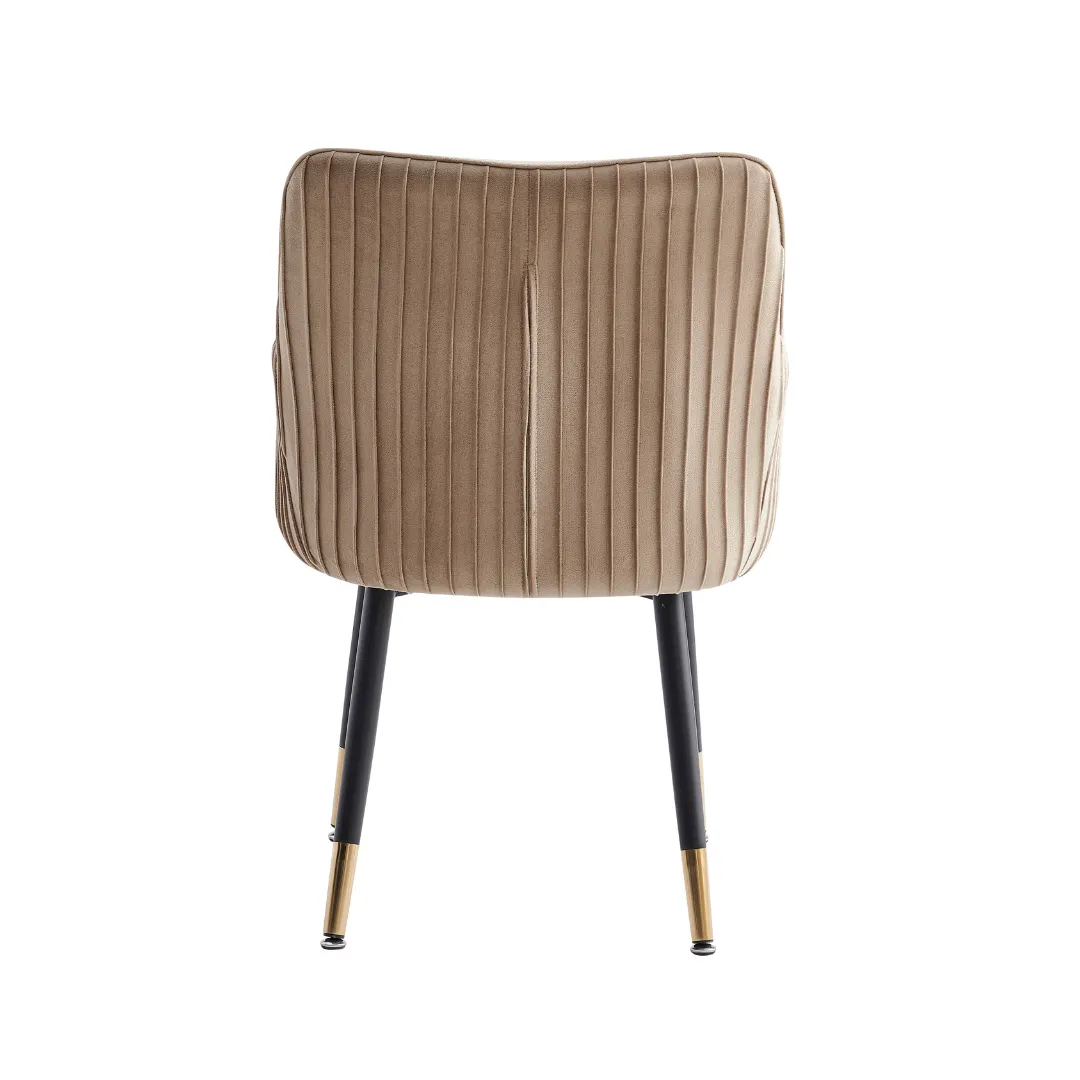 The front profile showcases smooth, tailored upholstery with integrated armrests for added comfort, while the back reveals a striking vertically ribbed texture that adds depth and sophistication. Supported by sleek black metal legs with gold-tipped accents, the Wilcox chair delivers a premium finish that complements both minimalist and luxurious interiors.