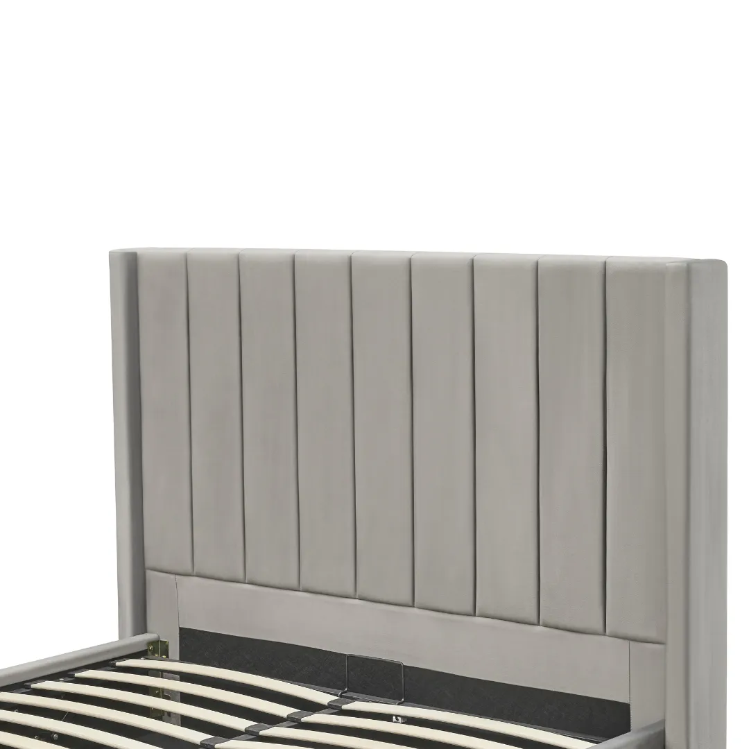 The Opal Bedframe is a stunning blend of contemporary elegance and practical functionality. Upholstered in a luxurious silver fabric, this bedframe features a sleek vertical panelled headboard that adds a sophisticated touch to any bedroom décor.